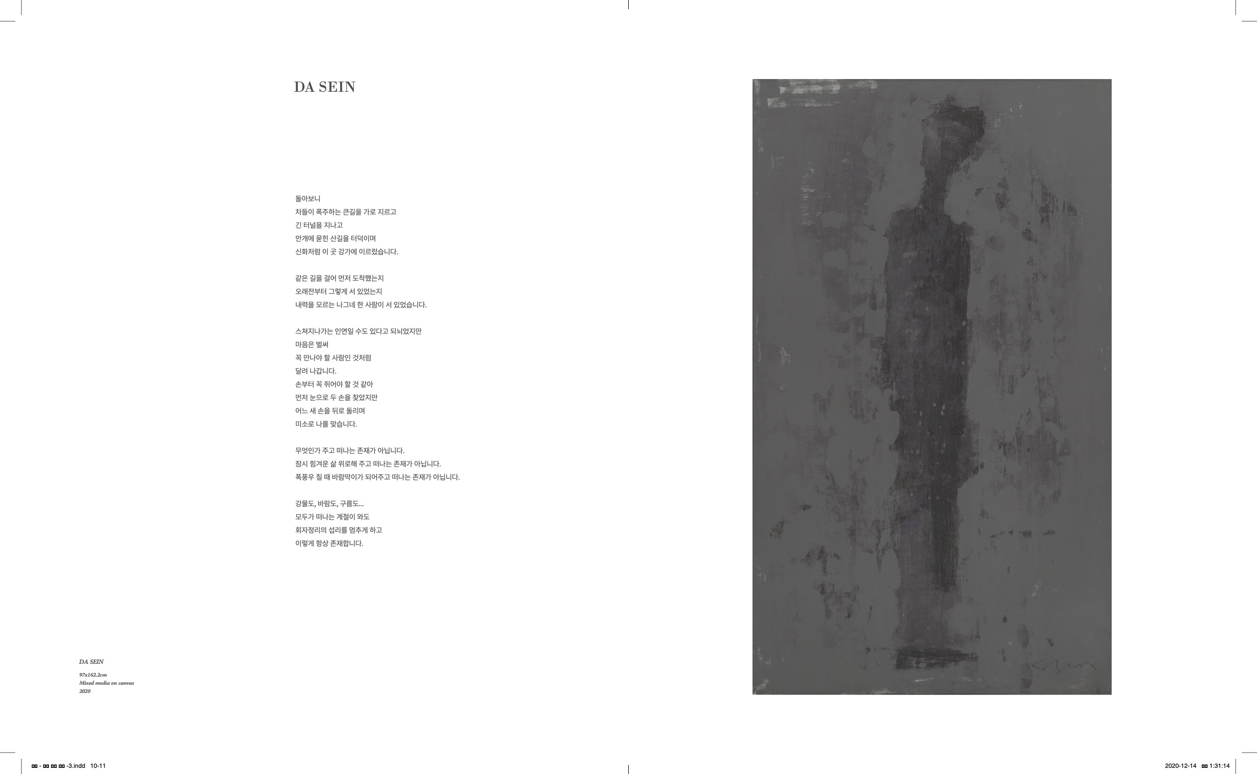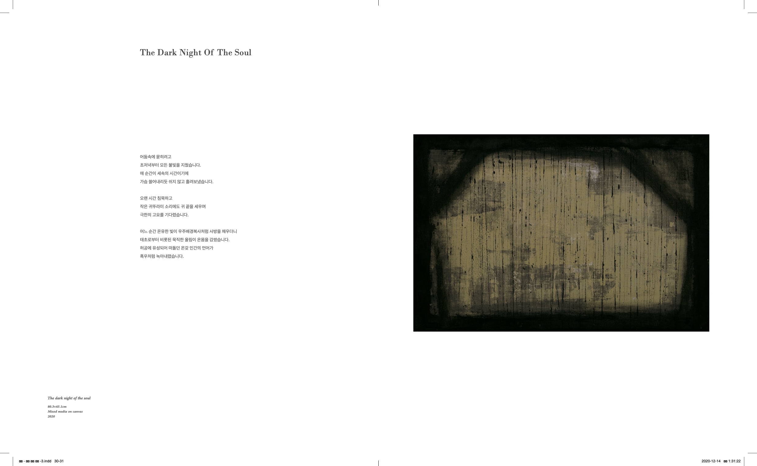 최선 작가의 시간은 우리에게 익숙한 자연적 시간 흐름과 엇박자로 움직이고 있습니다. 모두가 한 방향의 흐름을 지향할 때 본인은 전혀 다른 시간의 틈을 찾아 그곳을 비집고 자신의 ‘존재의 자리(Sitz des Seins)’를 그곳에 마련했습니다. 마치 절대자와의 깊은 교류를 위해 ‘광야’로 스며들었던 많은 구도자들을 연상시킵니다. 특히 ‘임박한 종말과 메시아의 출현’을 간절히 소망하던 팔레스타인의 유대인들이 추구하던 일반적인 시간을 뚫고 광야의 시간을 선택한 세례자 요한(John the Baptist)이 연상됩니다. 모든 사람들이 갈망했던 물질적 풍요와 평안한 삶을 버리고 추위와 고독의 ‘영혼의 어두움 밤(St. John of the Cross)’을 찾아 광야로 나갔던 사람입니다. 이러한 그를 성서는 이렇게 증언하고 있습니다. “일찍이 여자의 몸에서 태어난 사람 중에 세례자 요한보다 더 큰 인물은 없었다.”(공동번역 마태11:11) 그는 인간이 근접할 수 있는 실존의 한계를 발견했던 사람입니다. 그는 자신 만의 ‘시간의 틈’에서 세상이 갈망하던 시간과 다른 새로운 시간을 발견했습니다. 그 시간은 인간에게 구원을 가져올 한 사람에 대한 시간이었습니다. 모든 사람들이 알아보지 못했던 한 젊은이를 그는 이 새로운 시간의 주인인 ‘메시아’로 알아볼 수 있었습니다. 모두가 같은 시간을 공유할 때 볼 수 없었던 것을 자신 만의 시간 속에서 발견하게 된 것이지요.